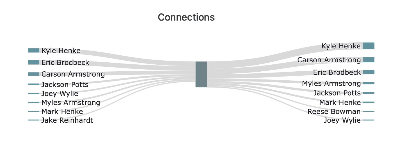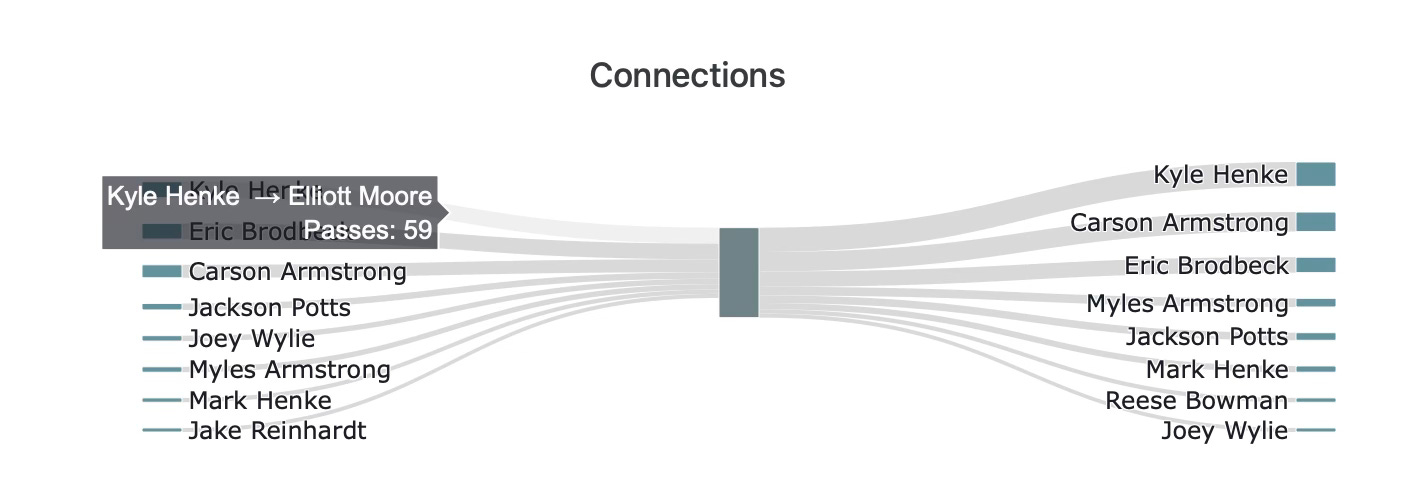 Connection sankey diagrams visualize how frequently a player receives passes from or throws to specific teammates. They highlight preferred connections and targeting tendencies, making them a valuable tool for coaches looking to understand player habits and decision-making. For instance, a handler with unusually high swing-to-handler rates may fall back on resets under pressure, while a cutter with elevated deep-throw tendencies might attempt more hucks when faced with tight coverage. It could also reveal players who typically receive from handlers but distribute to cutters, or possibly the reverse.