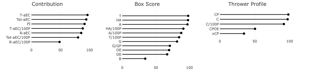 · Thrower profile metrics: Completion Percentage, Expected Completion Percentage (xCP), and Completion Percentage Over Expectation (CPOE)