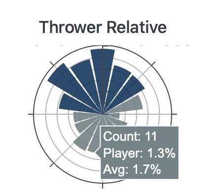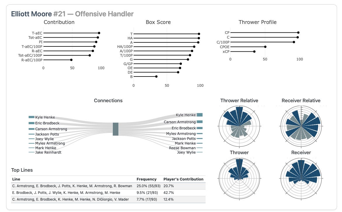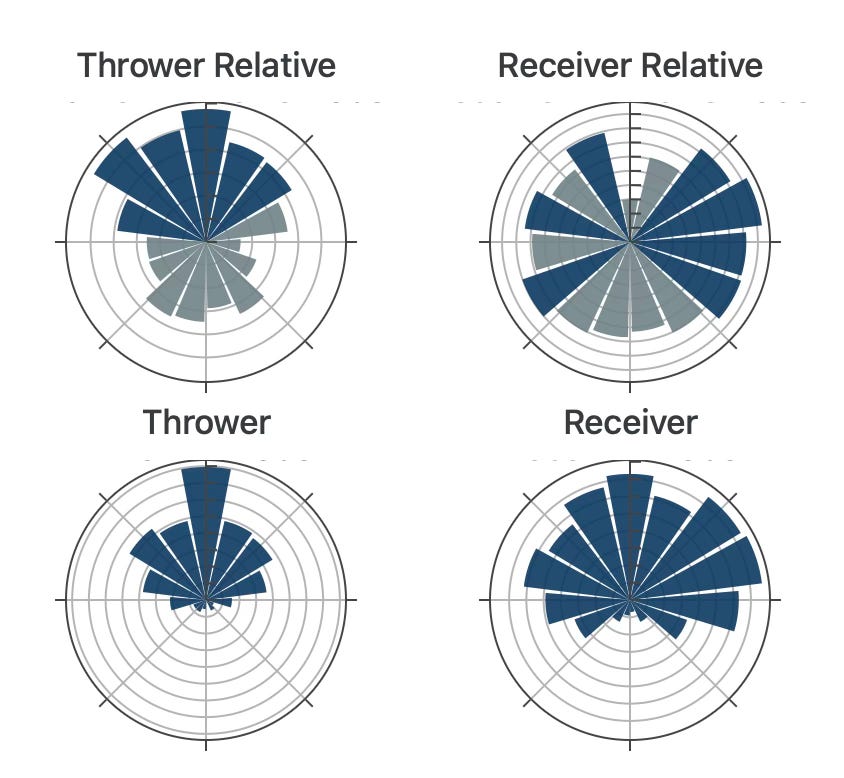 Beyond single metrics, player cards map throwing and receiving tendencies through connection diagrams and radar charts. These visuals reveal preferred throwing and receiving partners, the frequency of handler-to-handler interactions, and downfield targeting habits. The relative radar charts add another layer by showing deviations from league-average behavior, where the size of the bar reflects how often that throwing or receiving angle is used compared to the league norm rather than the absolute number of attempts. Gray bars indicate below-average usage, while blue bars indicate above-average usage. From a scouting perspective, this means you’re not just seeing what a player does, but rather you’re seeing how their habits stand out from the rest of the league, helping you identify which throwing lanes or receiving zones they’re most comfortable exploiting and which ones they may avoid.