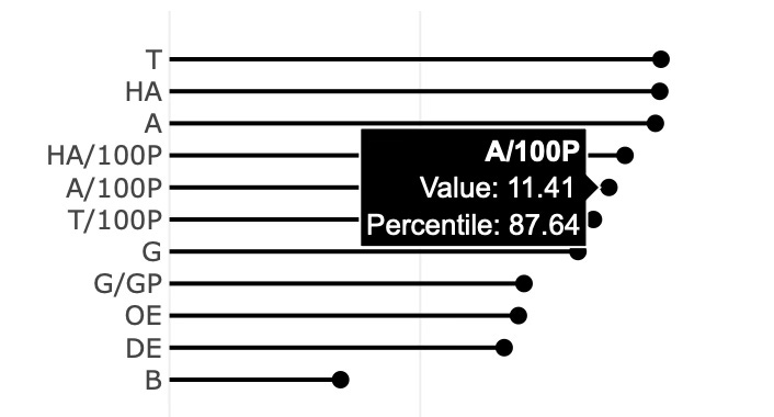 Player cards condense a player’s impact into a single, data-rich view giving coaches, analysts, and players rapid access to insights. At the top of each card is a set of lollipop graphs showing: