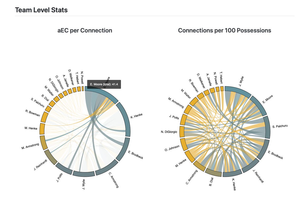 At the team scale, one of the most revealing tools we offer is the chord diagram. This visualization complements the individual connection data you’ll see later in the player cards, but flips the perspective: instead of focusing on one player’s network, it maps the adjusted Expected Contribution (aEC) for every significant passing connection, alongside a second diagram with completions per 100 possessions. The effect is a panoramic view of team interactions paired with a precision lens for spotting where value is truly generated. By normalizing completions per 100 possessions, this visualization levels the playing field between high-usage players and those with limited minutes, removing bias related to playing time or line assignments. That makes hidden strengths and costly inefficiencies far easier to uncover.