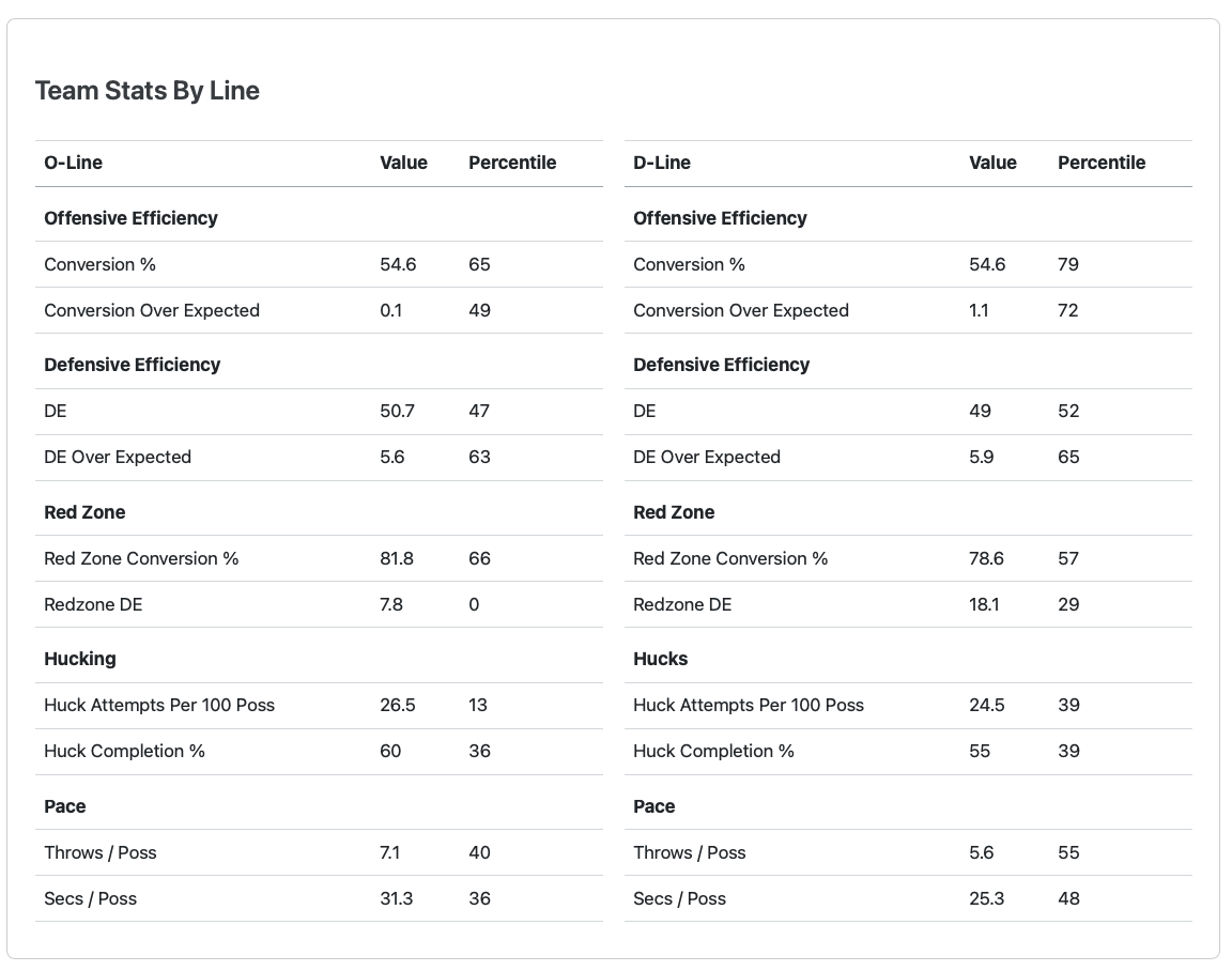 Dive into the offensive and defensive line metrics to uncover specific strengths and weaknesses on both sides of the disc. Treating these units separately provides a more nuanced view for targeted game planning and strategic adjustments.