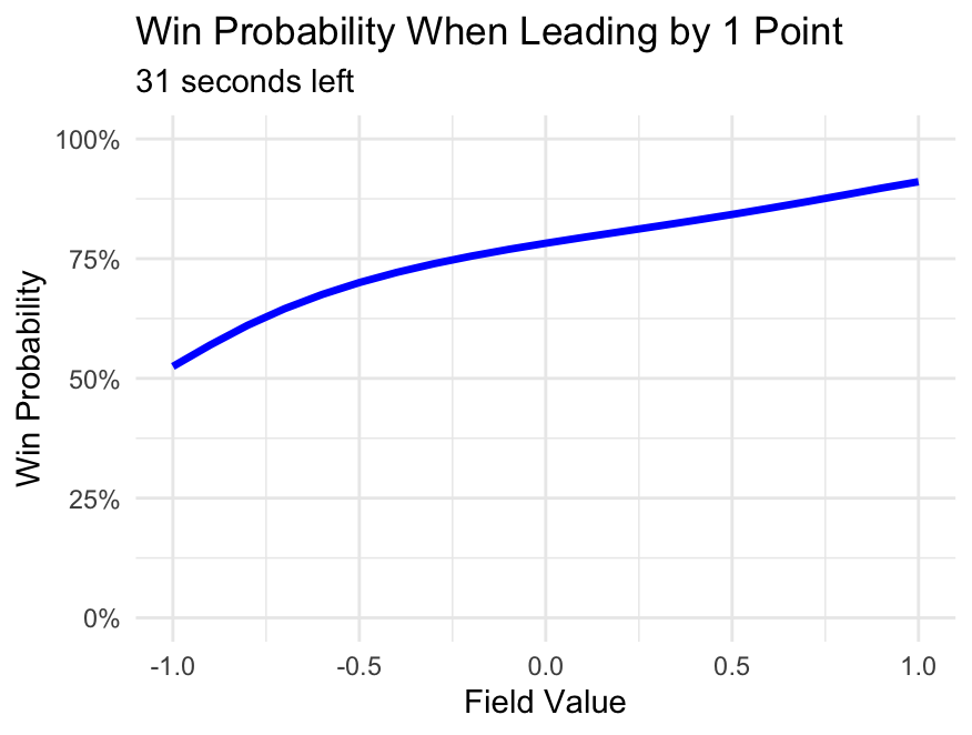 When losing by 1, field value drives predictable trends: a value of 1 (with possession at the goal line) brings win probability close to 50%, while a value of -1 (defending in your own redzone) drops the percentage to around 15%.