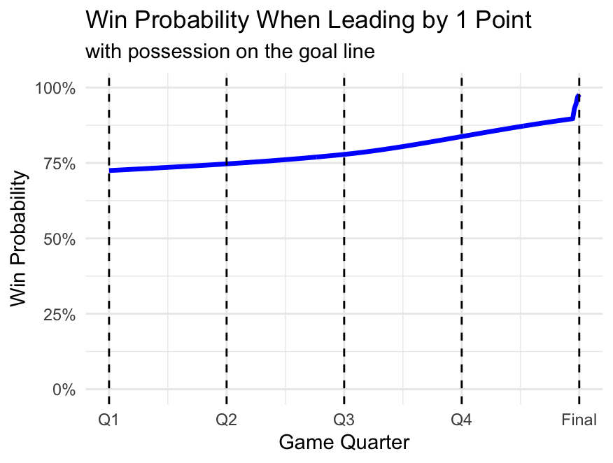 When leading by 1 and having possession on the goal line, win probability rises steadily as expected.
