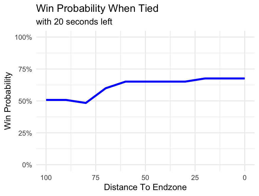Finally, our XGBoost model estimates win probability when tied with possession, depending on distance to the end zone with 20 seconds left.