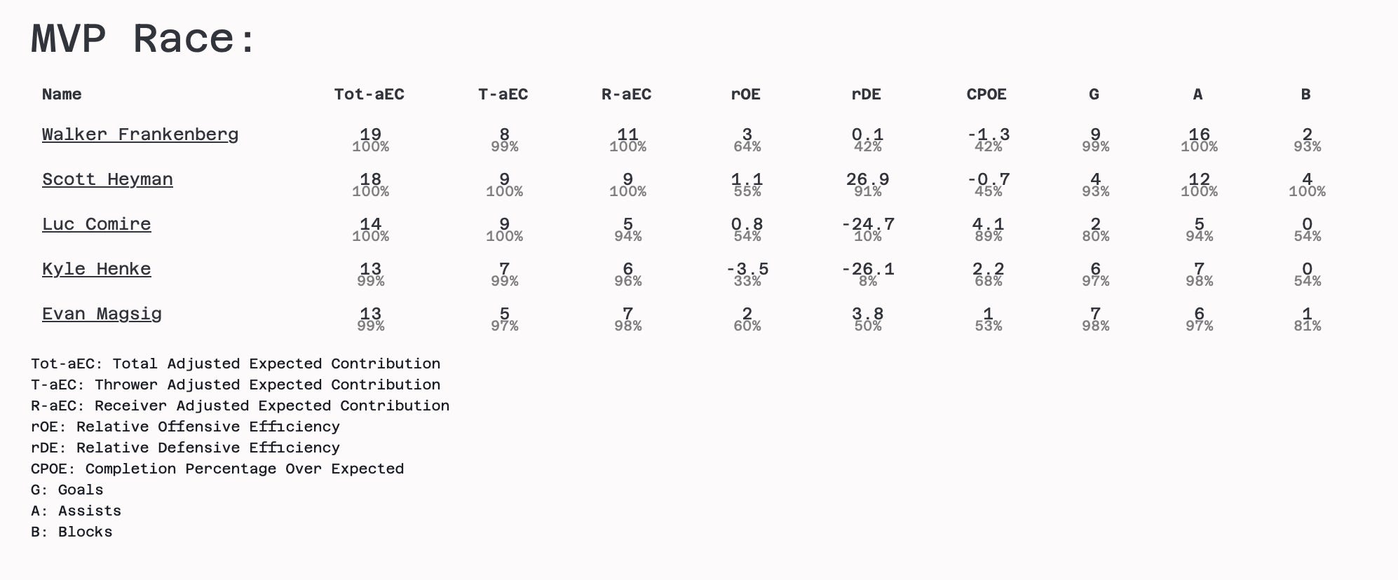 Shown Space is a new analytics website for ultimate frisbee, powered by UFA data and statistical modeling/machine learning (whichever sounds less daunting to you). We go beyond surface-level stats, breaking performance into four key areas—Defense, Throwing, Receiving, and Team Impact—with custom metrics that reveal deeper insights. Check out the website at shownspace.com.