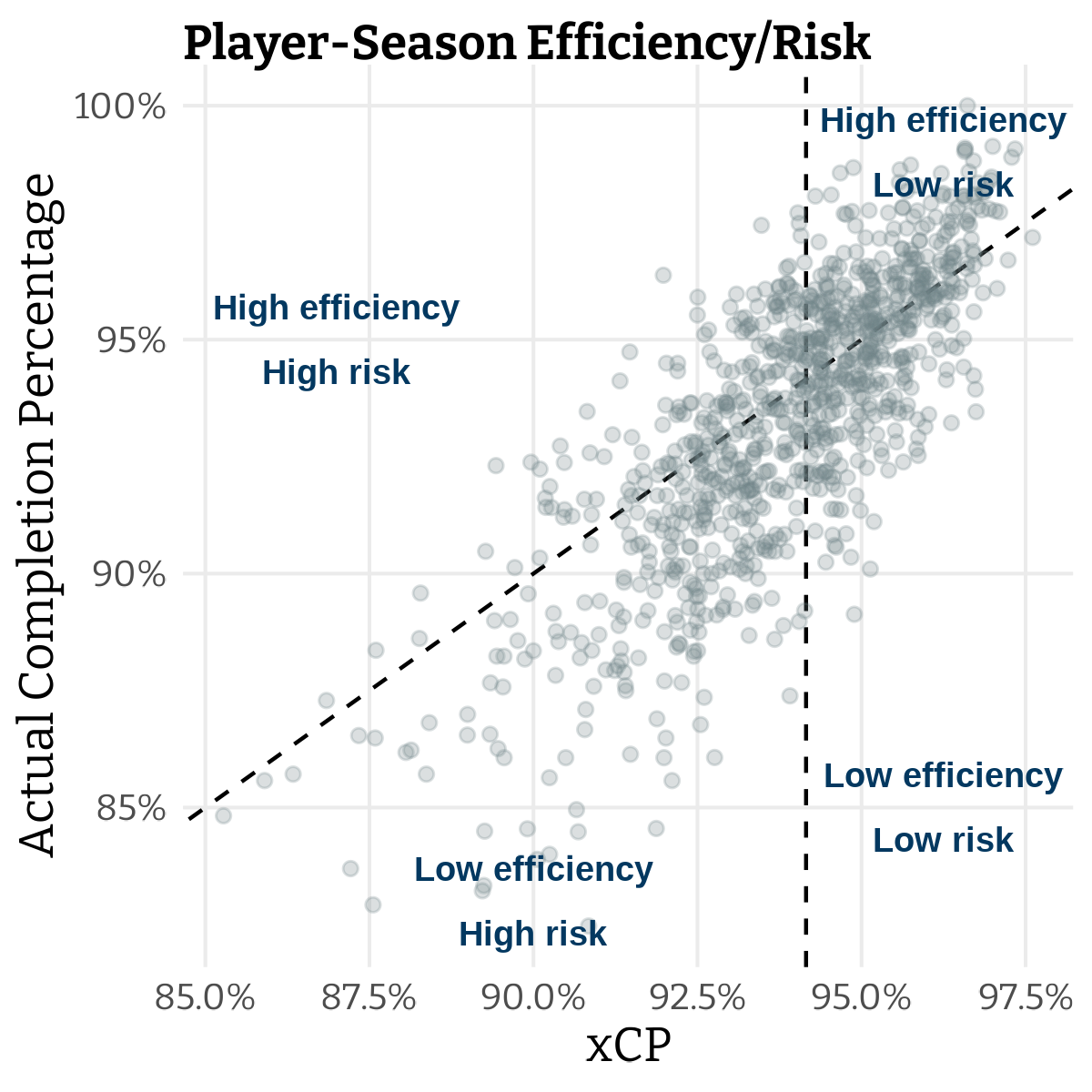 Risk and reward come into balance—There’s no single correct way to make decisions—but xCP and CPOE quantify the risk and reward behind each one, offering a fuller picture of a player’s decision-making style and effectiveness.