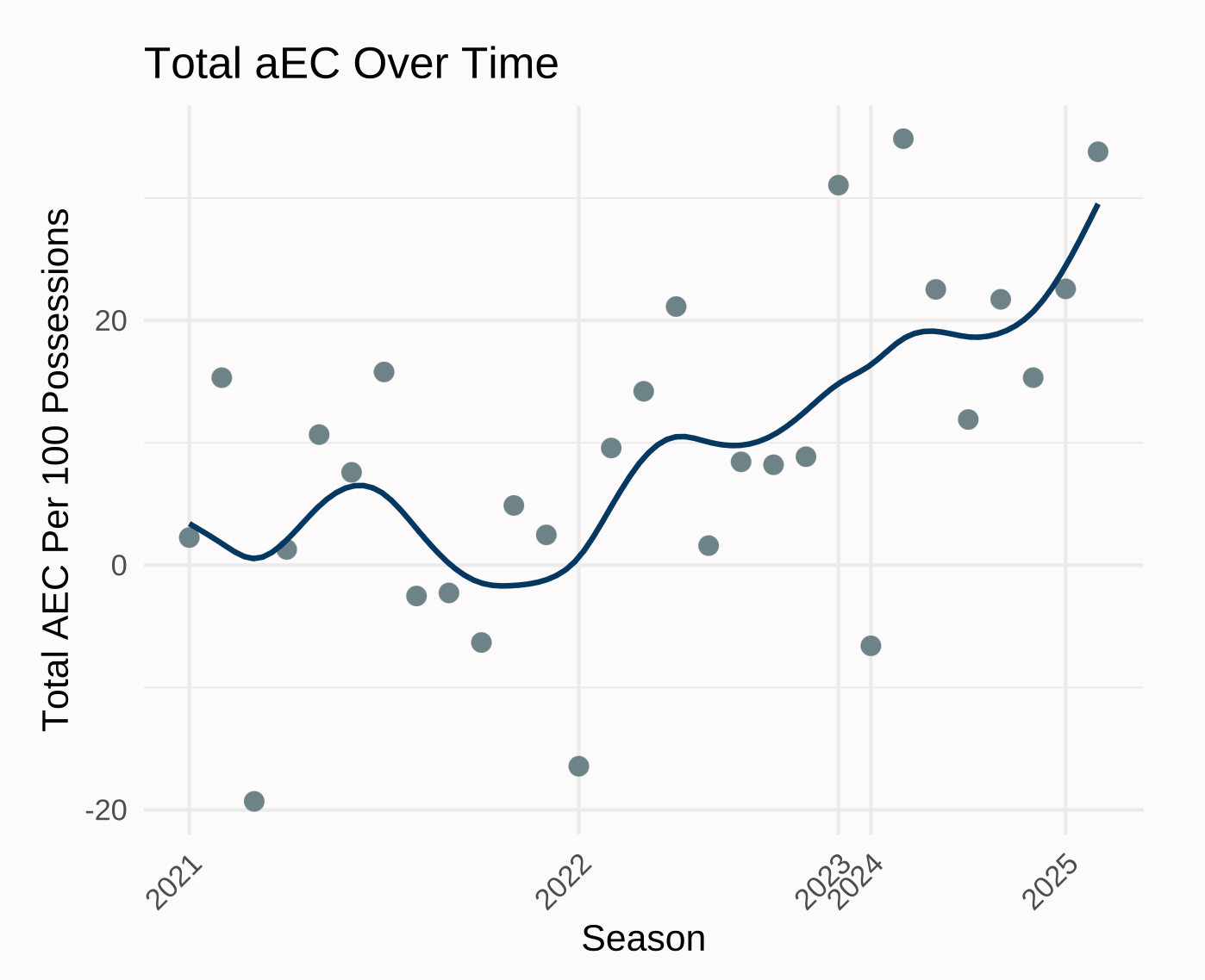 Track Player Efficiency Trends: Visualize how a player’s total aEC changes over time. This plot highlights performance consistency, breakout games, and potential slumps—giving coaches, analysts, and fans a tool to assess growth, impact, and momentum across a season or career.