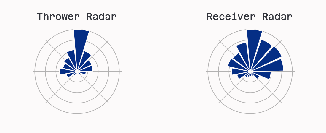 More to come, but this is currently explored through radar charts that show the directions and relative frequency of the direction that a player throws to and get receptions from.
