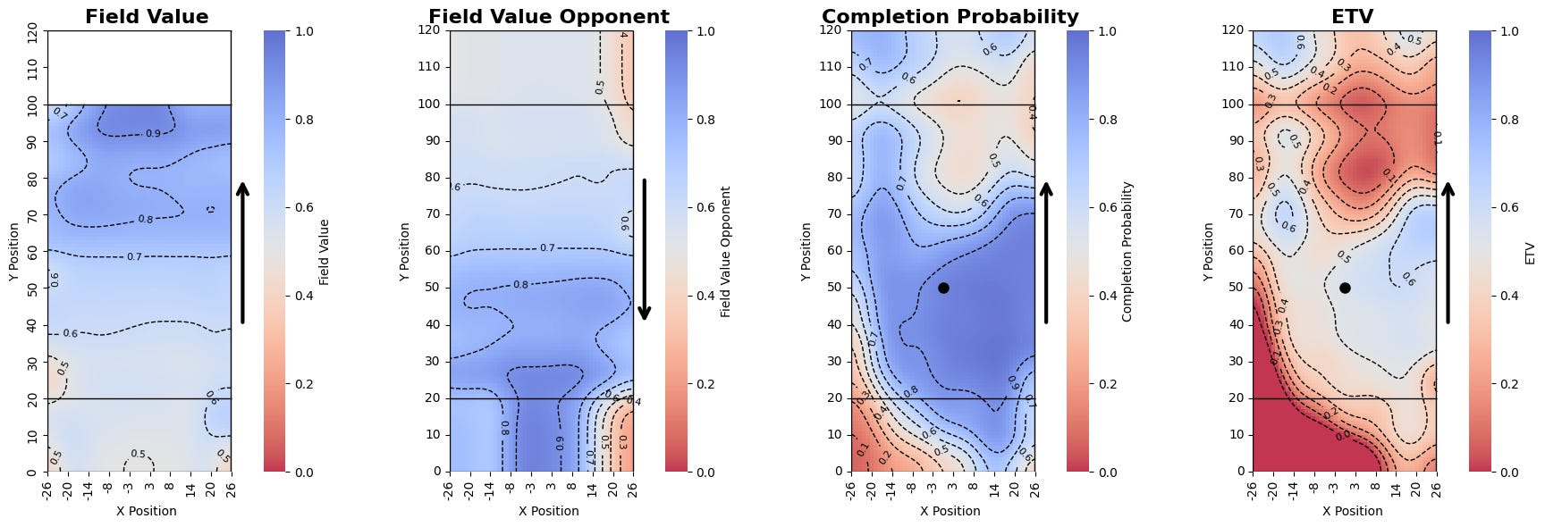 The first model evaluates field value (FV)—It considers positional and time context to calculate how much a given position and time contributes to the chance of scoring. This gives us a baseline for understanding the value of movement and positioning across the game.